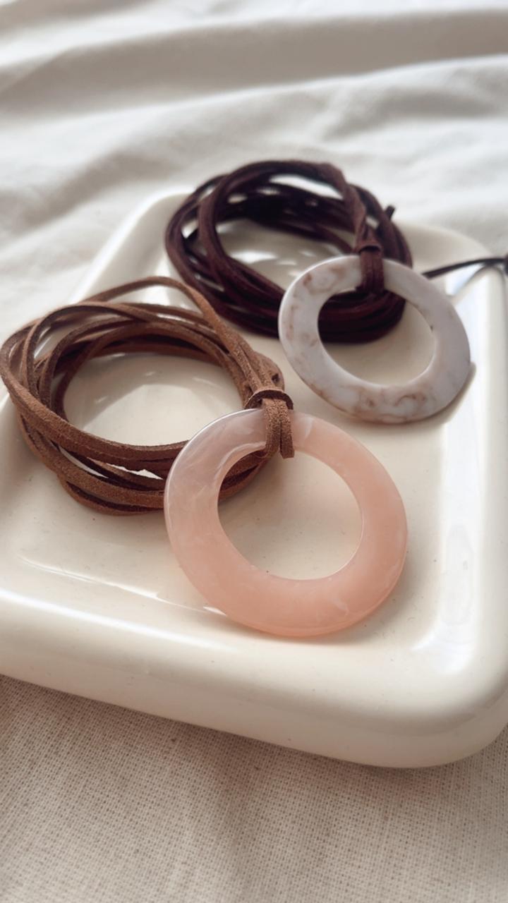 Simple y liviano, realizado con 1,50 m de cordón de gamuza y aro central de resina marmolada.